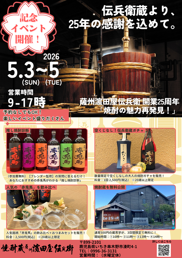 2026年4月に開業25周年という大きな節目を迎える、濵田酒造株式会社「焼酎蔵 薩州濵田屋伝兵衛」(代表取締役社長:濵田光太郎)は、2026年5月3日(日)~5日(火・祝)の3日間限定の特別イベントを開催いたします。午年ゴールデンウィーク限定企画「焼酎の魅力再発見!」と称し、これまでのご愛顧への感謝を込めて、楽しみながら焼酎の魅力を再発見できる企画をご用意いたしました。