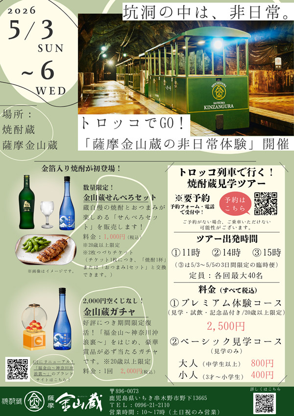 薩摩金山蔵株式会社(代表取締役社長:濵田光太郎)は、2026年4月29日(水・祝)および5月2日(土)~ 6日(水・祝)の計6日間、ゴールデンウィーク特別企画「トロッコでGO!薩摩金山蔵の非日常体験」を実施いたします。