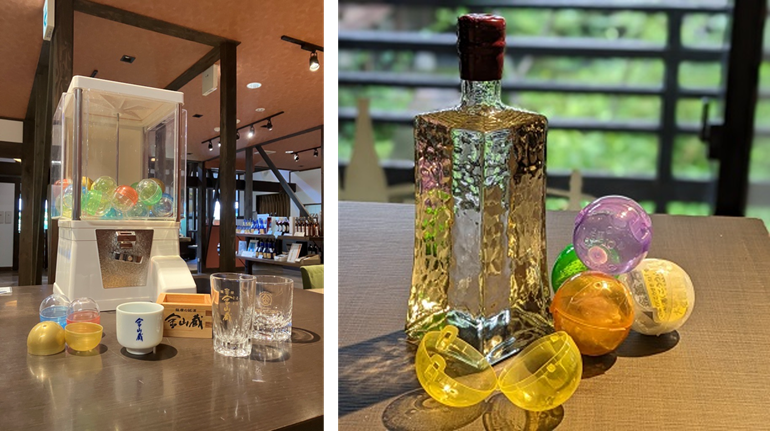 前回の目玉でもあった、ラベルにメッセージを書いて、ご指定の期間中、地下坑洞内でお預かりする、タイムカプセル焼酎「熟成と共に福来たり」のほか、4月9日(木)新発売の浮世絵師・葛飾北斎の作品とコラボした「福金山~神奈川沖浪裏~」、金山蔵オリジナルグッズ等の豪華な賞品が当たる空くじなしの大人向けの酒ガチャです。※お酒が入っていますので、20歳以上のお客様限定となります。