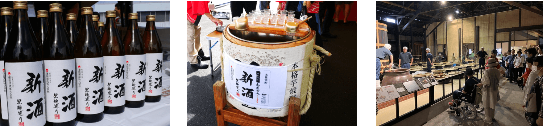 蒸留酒である本格芋焼酎も、ワインのヌーボーのように「新酒」が存在します。「新酒」とは、その年に収穫されたさつまいもで造り、蒸留したばかりの焼酎を指します。通常は、蒸留後に半年から1 年ほど寝かせてから瓶詰めしますが、「新酒」は蒸留後まもなく瓶詰めすることで、出来たばかりの風味を味わうことが出来ます。その年ごとに酒質は異なり、さつまいもの香りや味わいが特徴としてしっかりとあらわれます。濵田酒造ではこの出来立ての「新酒」を振る舞う場として、20年以上にわたって新酒まつりを継続開催しています。