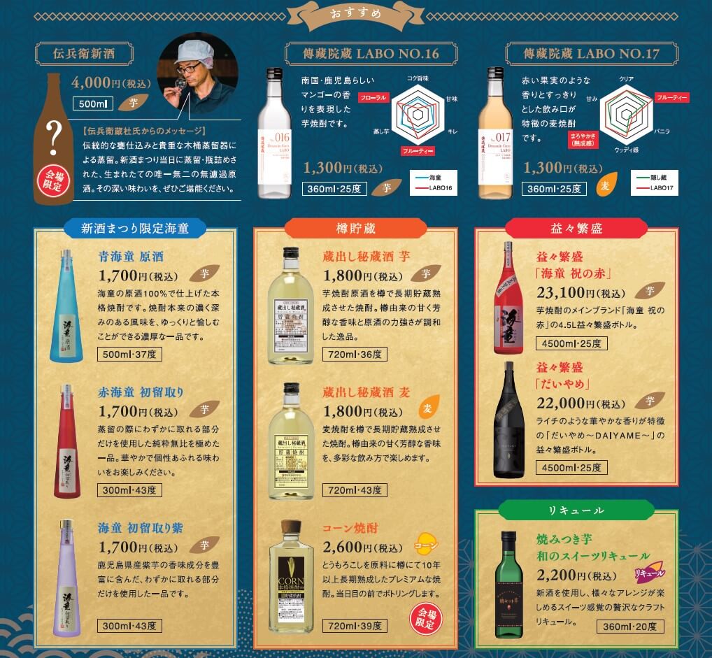 毎年の新酒まつりで人気の「新酒 初蔵仕込み」や「傳藏院蔵LABOシリーズ」はもちろん、蔵元自慢の本格焼酎やリキュールを多数ご用意しています。また、商品は公式オンラインショップ「Shochu.Life」でもご購入いただけます。